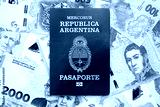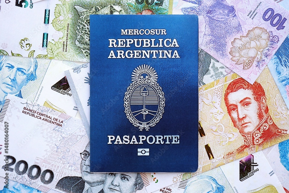 Argentine passport lies on Argentina pesos money bills close up. Travel and citizenship