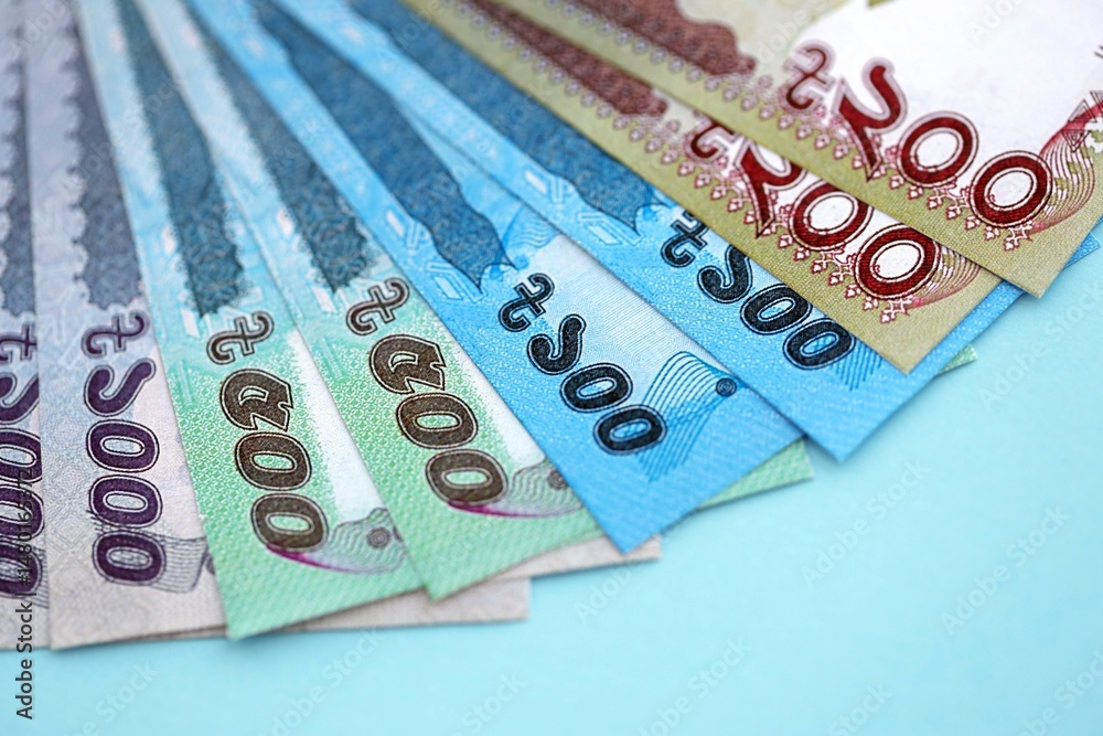 Bangladeshi taka money bills in big amount lies on teal color table close up