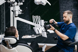 A dentist takes pictures of a client's teeth on a camera during an appointment at a dental clinic. Dental clinic. Concept of dental services and treatment.