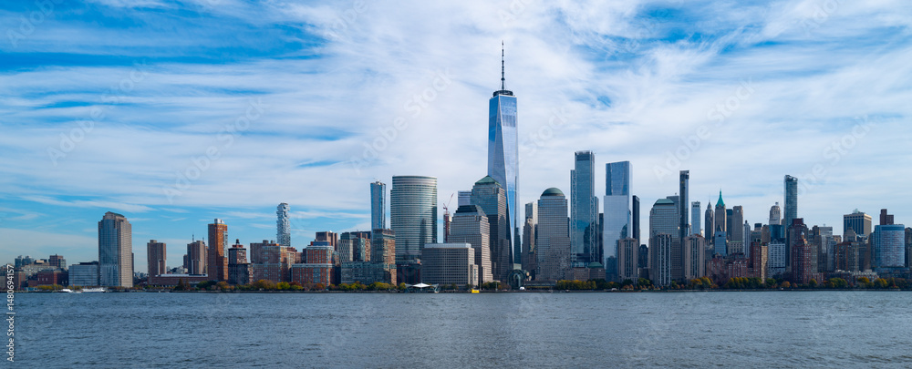 New York City cloudy skyline. NYC skyscrapers. Manhattan. NY cityscape with clouds. Downtown New York buildings. NYC skyline on clouds. New York harbor view. Skyscrapers in Manhattan. NYC downtown.