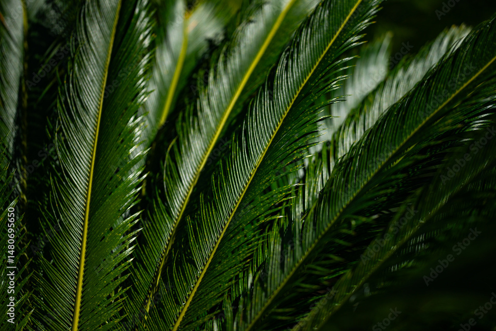 Palm leaves background. Green leaves wallpaper. Exotic jungle foliage. Leaves tropical greenery. Palm leaf closeup shot. Tropical leaf pattern. Nature palm leaves design. Green palm background.