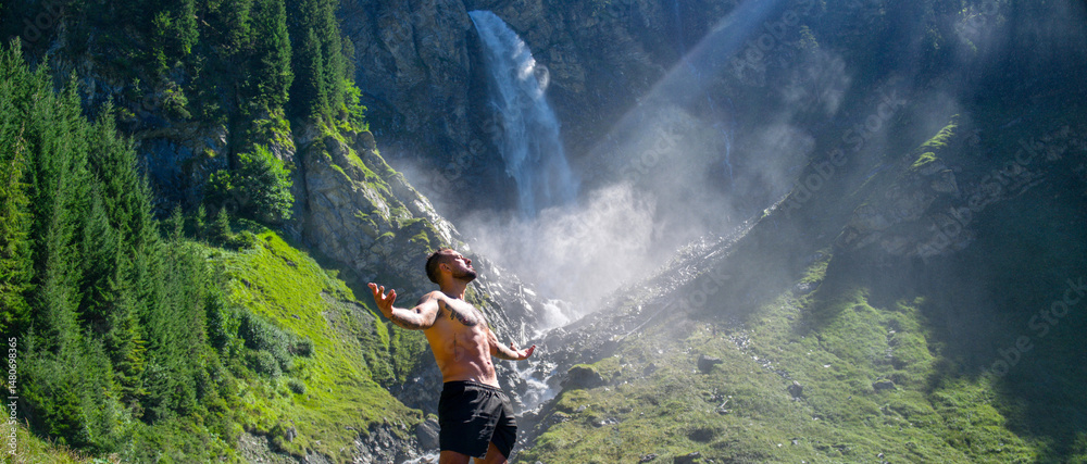 Carefree man in waterfall. Man freedom in waterfall landscape. Muscular man breathing fresh air on beauty waterfall. Topless model with raised hands on mountain nature landscape. Yoga by waterfall.