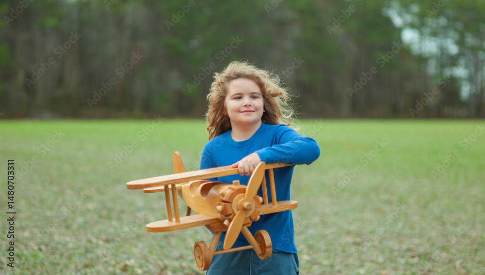 Happy child play with wooden plane outdoor. Child playing with toy airplane. The dream of becoming a pilot. Happy child playing with toy airplane in park. Child dreams of traveling. Kid pilot aviator.