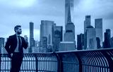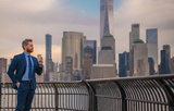 Business man on coffee break. Businessman at coffee break. Coffee break for business men. Businessman in business district in NYC. Coffee break in New York city. Business man hold take away drink.