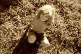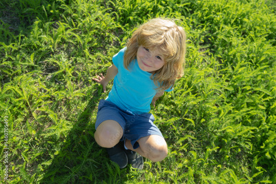 Happy little boy lying on the grass at the summer park. Portrait of a smiling child lying on green grass outdoor.