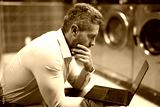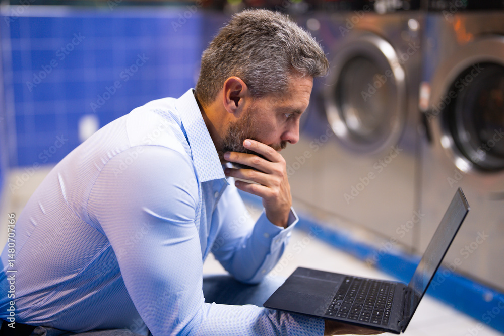 Tight schedule and time management. Effective planning in schedule. Well-organized man in public laundry. Work-life balance. Overloaded schedule for busy mature business man. Busy schedule.