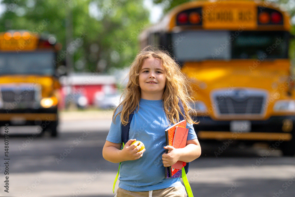 School bus waiting for child student outdoors. Blonde kid with backpack and note books to go school. Outdoor walk to public school. Education, studying and knowledge concept in American school.