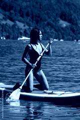 Summer sexy woman on paddle board. Nature and paddle in the Alps. Beauty woman near mountain. Summer vacation. Summer traveling. Bikini model by lake. Tourism lifestyle. Girl on summer weekend.