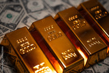 Money dollars vs gold bar. Precious metals. Saving finance in gold bar. Dollars vs gold bar. Saving money background. Dollar bills vs gold bars. Banking and savings. Golden metal.