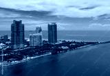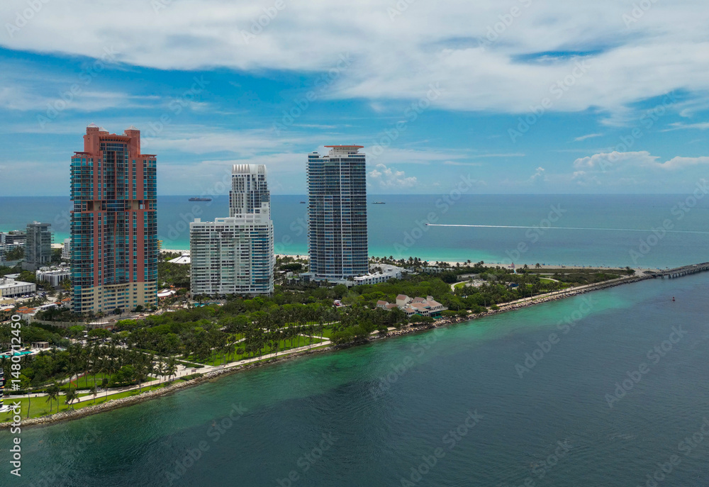 Aerial view of Miami Beach with turquoise waters. Drone shot of Miami skyline. Top view of South Miami Beach. Miami cityscape with luxury skyscrapers and ocean. View of Miamis famous skyscrapers.