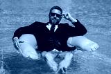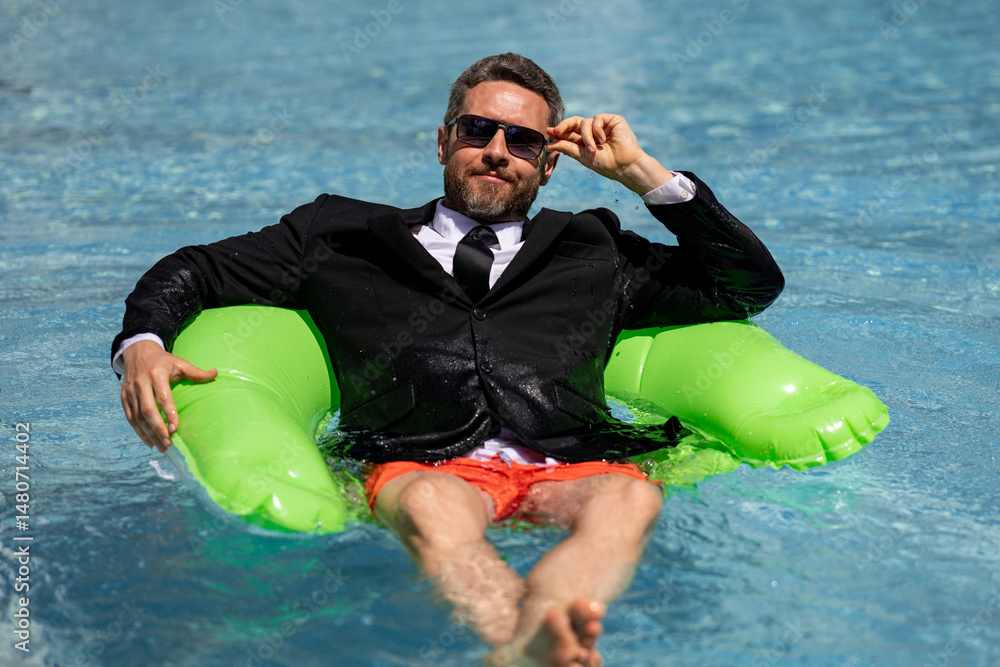 Fun business. Remote job by beach. Summer vacation with laptop. Freelance summer business. Business humor. Handsome businessman in suit swim in water. Relaxing after job. Crazy business.