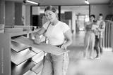 Young woman buyer chooses sample of laminate flooring in hardware store