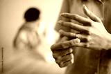 Emotional woman holding ring near distant husband, symbolizing possible separation.