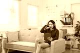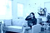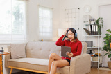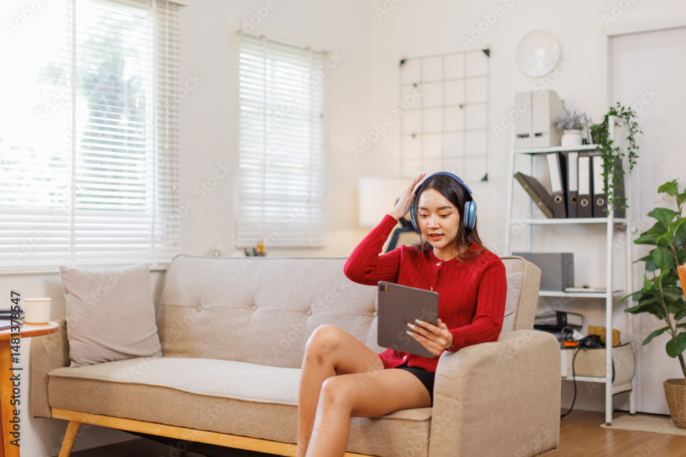 A cheerful woman wearing headphonessits comfortably on the fsofa tablet in hand, engaged in a videocall. She leans against her couch in a cozy living room relaxed conversation.