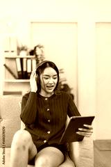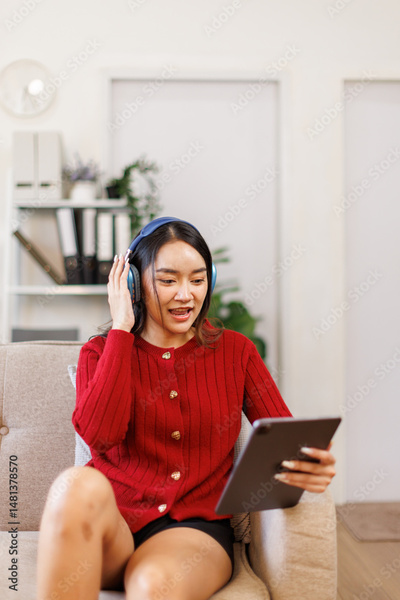 A cheerful woman wearing headphonessits comfortably on the fsofa tablet in hand, engaged in a videocall. She leans against her couch in a cozy living room relaxed conversation.