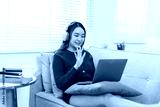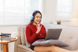 Happily asian woman wearing headphones holding working from home on her laptop while lying on sofa in bright apartment cheerful remote work lifestyle.