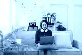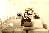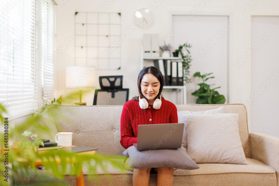 Happily asian woman wearing headphones holding working from home on her laptop while lying on sofa in bright apartment cheerful remote work lifestyle.