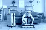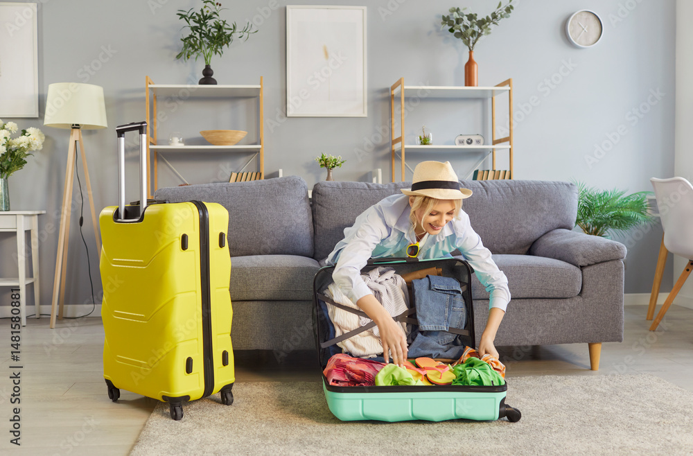 Satisfied woman packing suitcase at home, preparing for summer vacation or travel trip, organizing baggage for holiday in a cozy setting with excitement and anticipation for adventure.
