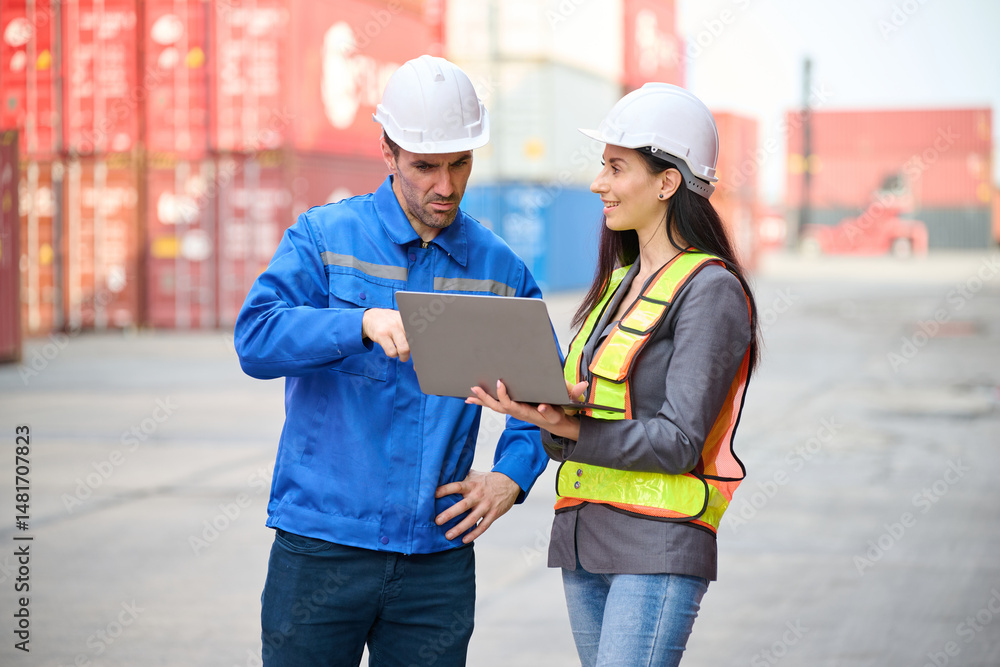 Engineers or workers using laptop computer and talking about work in containers warehouse storage