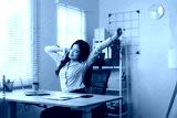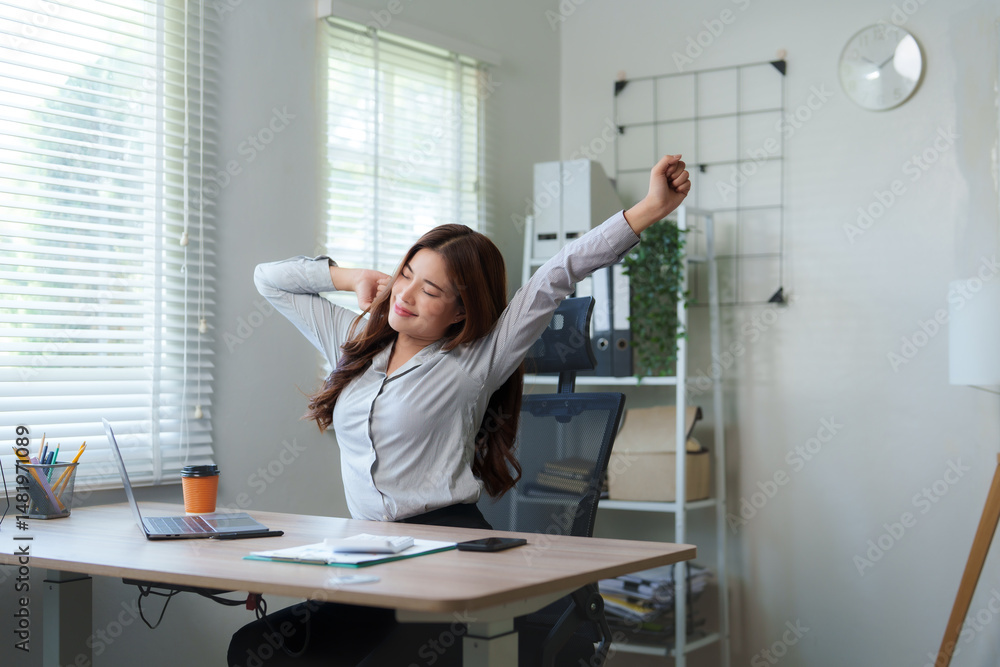 Businesswoman stretching at desk in modern office