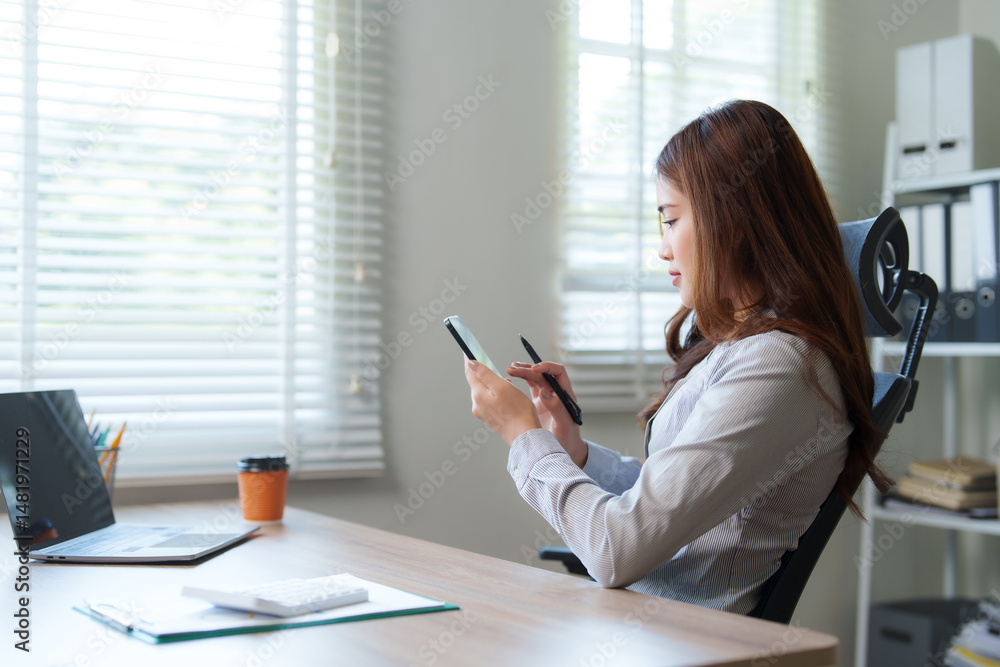 Businesswoman working with mobile phone and pen in office