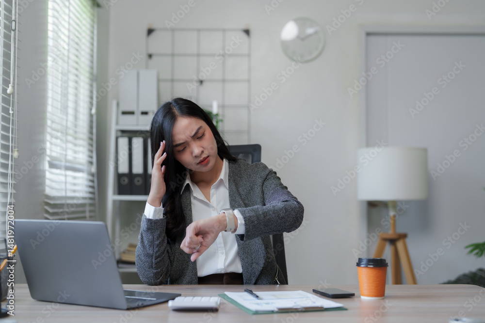 Stressed businesswoman checking time while working late in office