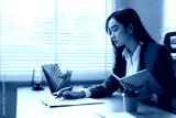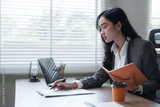 Businesswoman working with documents and notebook at office desk