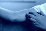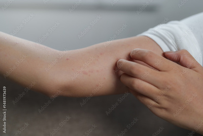 Patient scratching itchy rash on arm, skin allergy symptoms and treatment