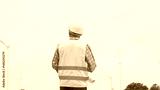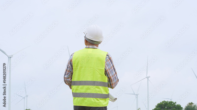 Engineer holding blueprint while surveying wind turbines at renewable energy site under bright sky conditions.