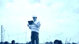 Engineer working with laptop at wind turbine field generating electricity for renewable clean energy