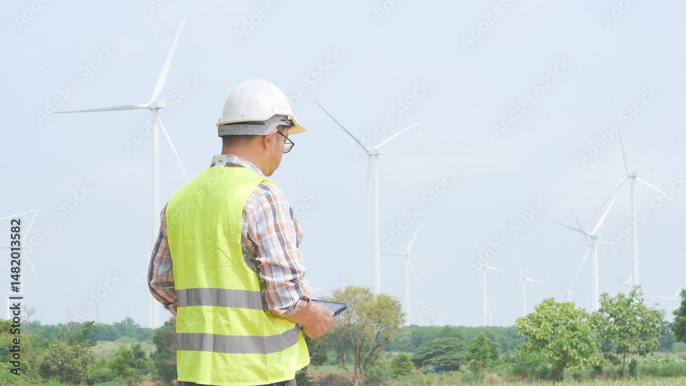 Engineer monitoring windmill performance with tablet at renewable energy field on a bright sunny day
