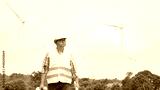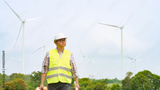 Engineer walking through wind farm with toolbox and blueprint for renewable energy maintenance and inspection