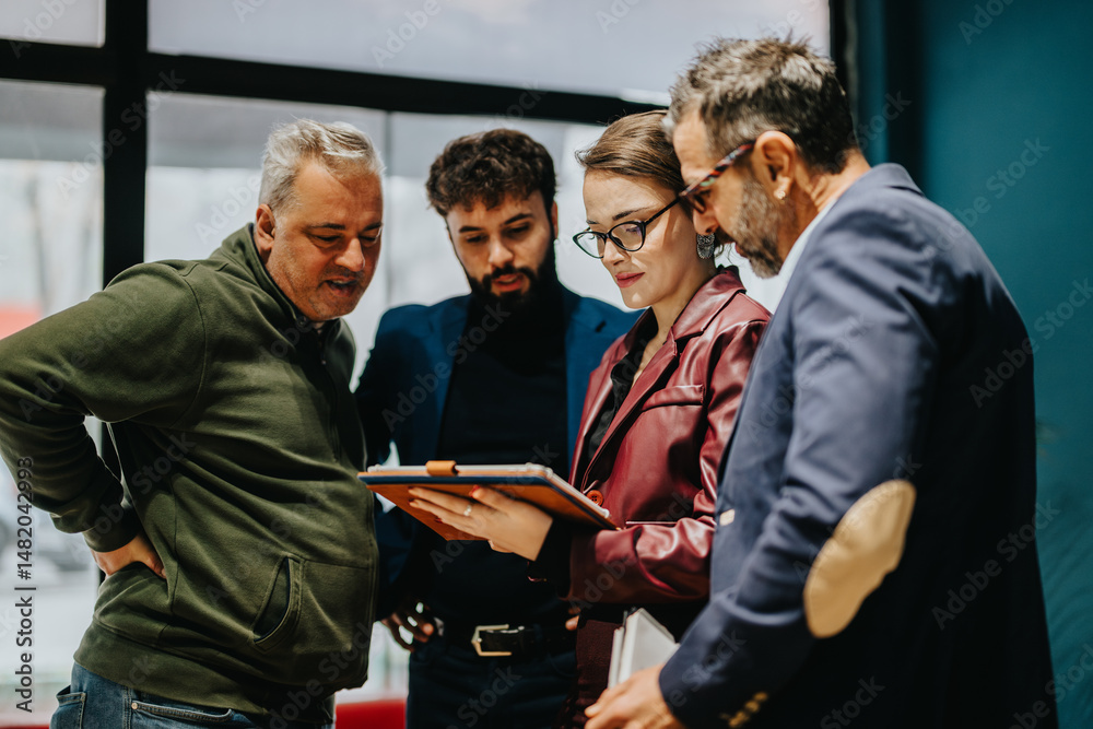 Four professionals engage in a focused discussion, reviewing documents, and sharing ideas collaboratively in an office environment.