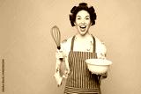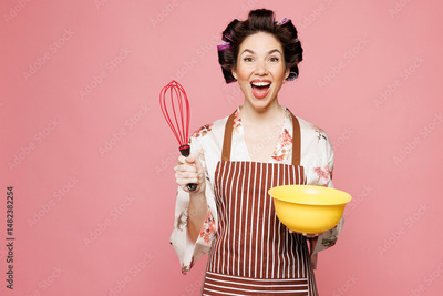 Young surprised fun housewife housekeeper chef cook baker woman wear brown apron hold in hand whisk and yellow bowl isolated on pastel light pink color background studio portrait Cooking food concept