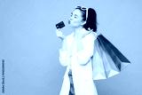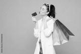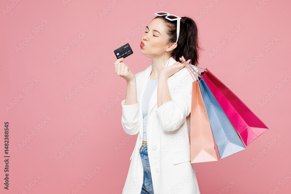Young woman wear white clothes hold in hand paper package bags after shopping, kiss mock up of credit bank card isolated on plain light pastel pink color background. Black Friday sale buy day concept.