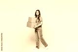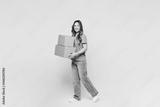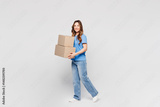 Full body young happy Caucasian woman wears blue t-shirt casual clothes hold blank cardboard box look camera walk go isolated on plain solid white color background studio portrait. Lifestyle concept.