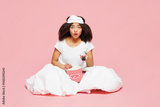 Full body sad young woman wear pyjamas jam sleep eye mask rest relax at home eat popcorn watch TV movie film isolated on plain pastel light pink background studio portrait. Bad mood night nap concept