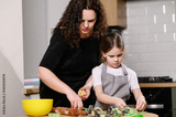 Mom and girl cooking cookies together in kitchen at home. Cute family baking sweet dessert. Mom, daughter rolling out dough and cutting out different cookie shapes, spending time together.
