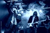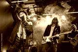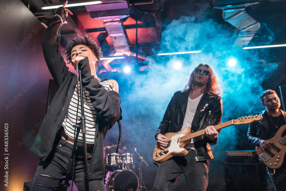 Female singer with microphone and rock and roll band performing hard rock music on stage