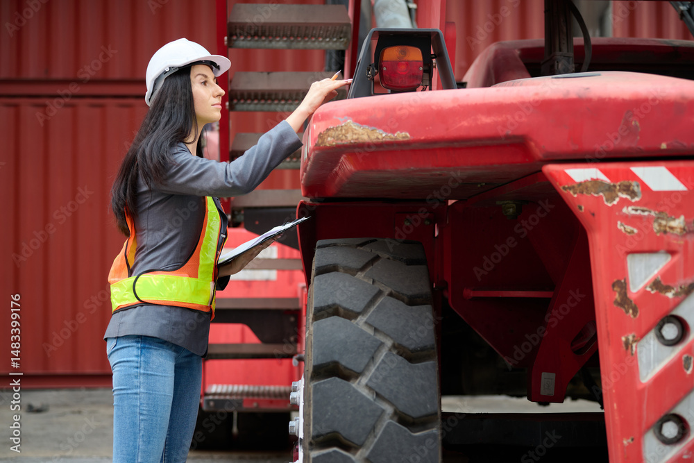 Engineer or worker checking solid rubber tire forklift in containers warehouse storage