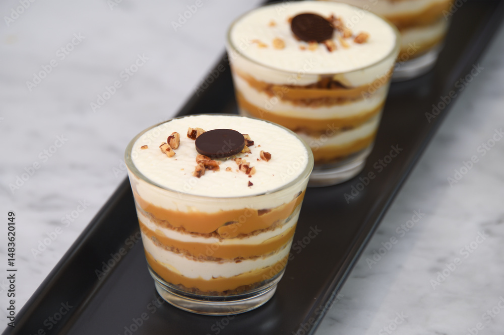 classic Tiramisu Dessert in clear glasses showcasing layers of coffee soaked, creamy mascarpone, and dusted cocoa topped with whipped cream, and chopped nuts closeup view of Italian dessert