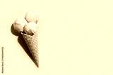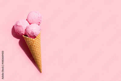 Strawberry pink ice cream scoops in waffle cone on pink background