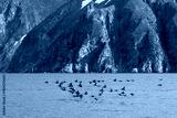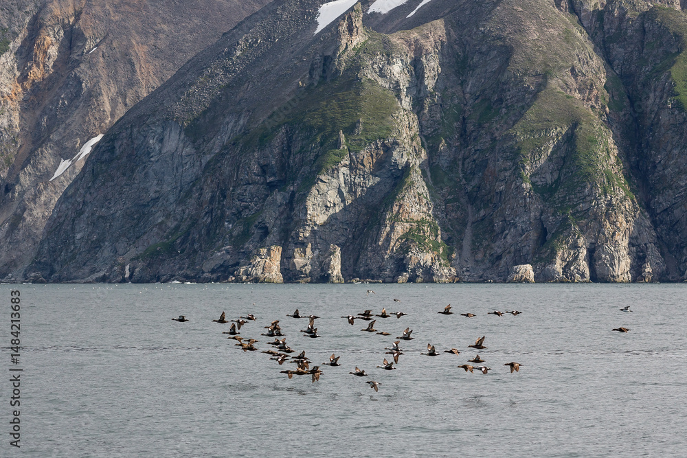 King Eiders (Somateria spectabilis). A flock of birds flies over the sea along a rocky coast. Wild birds in their natural habitat in the Arctic. Wildlife of Chukotka. Bering Sea, Far East of Russia.