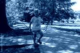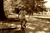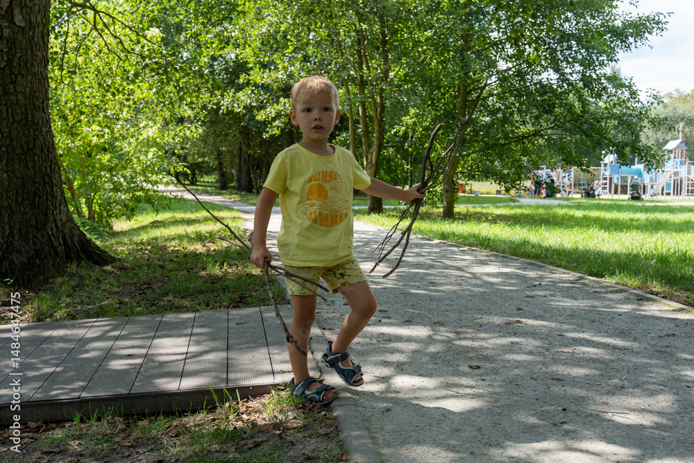 Curious little boy in yellow summer clothes holding sticks in both hands while walking in green park on sunny day. Concept of childhood, outdoor activity, creativity and nature exploration.