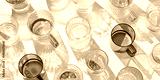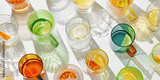 Top view colored Glasses of Drinking natural water with slises of lemon, orange shadow and sunlight reflection on white background, vivid modern banner, summer party concept, non alcoholic beverage