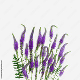 Natural blooming Purple flowers with green leaves on white background, card with copy space, minimal style aesthetic top view bouquet. Beautiful still life with wild field or forest flower
