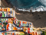 Aerial top view on colorful houses and black beach in small fisherman village, Punta Brava, Tenerife, Canary islands, Spain