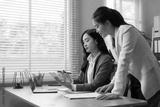 Businesswomen collaborating, calculating, and analyzing financial data in office