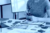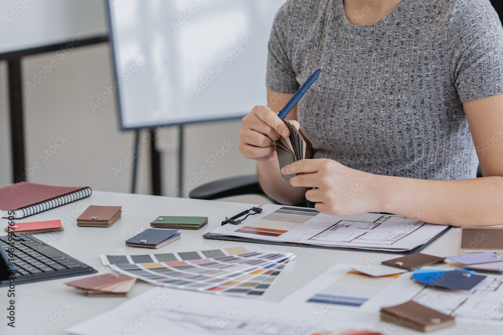 Architects interior designer hands working with Blueprints and documents for a home renovation for house design