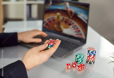 Playing online casino, holding chips, computer laptop male gambler, wager casino games through Internet, prolific online gambling, virtual poker website or platform for money, blackjack, video poker